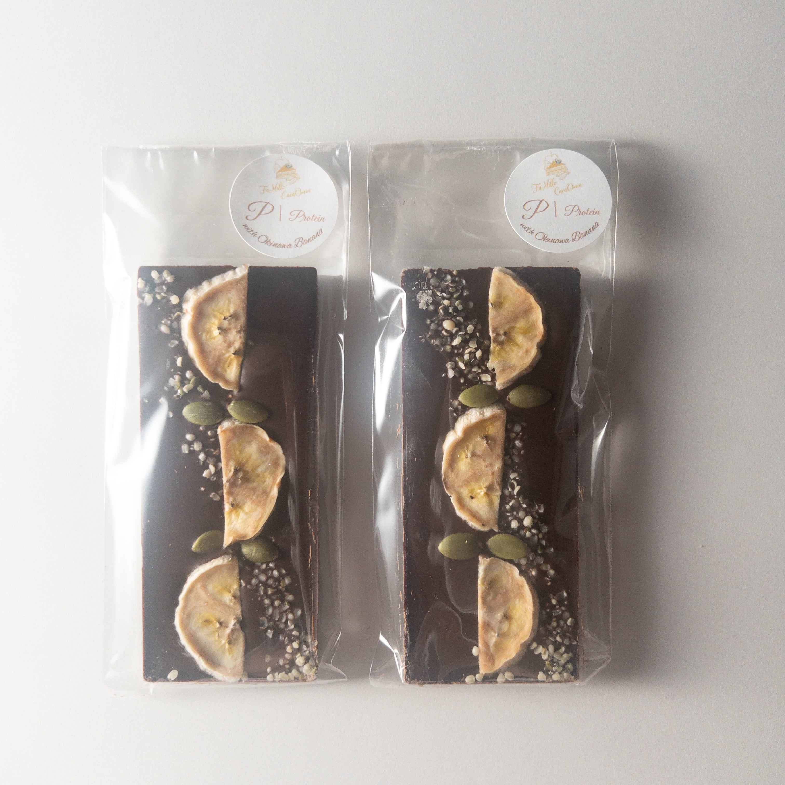 果肉感のある沖縄産ドライバナナを贅沢にのせた、タンパク質を意識したRawチョコレート。